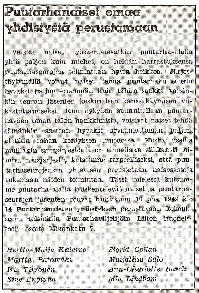 Lähde: Puutarhanaiset – Trädgårdskvinnorna ry 1949-1999 / Terttu Kalevi & Liisa Jyränkö